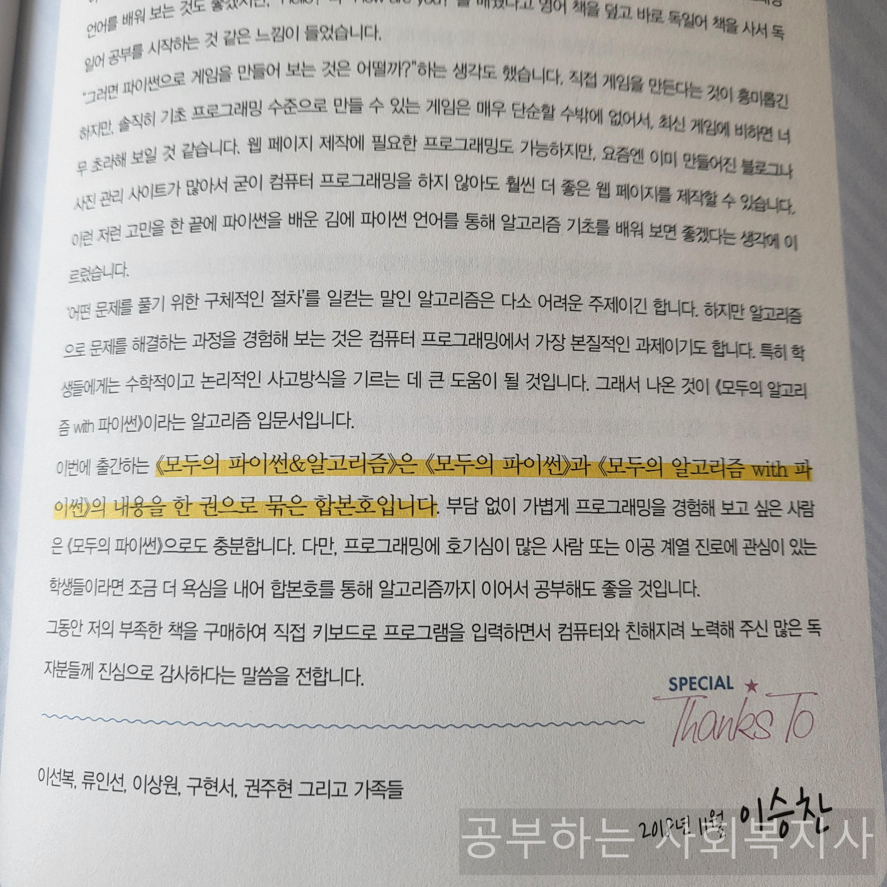 <모두의 파이썬>과 <모두의 알고리즘 with 파이썬>의 내용을 한권으로 묶은 책이라고 설명한다.