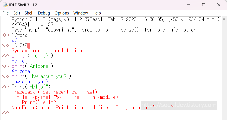 명령어 입력시 파이썬은 알파벳 대소문자를 구분하기 때문에 Print라고 입력하면 '이름에러'가 발생한다.