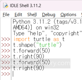 t.forward(n) - 앞으로 이동 / t.left(n) - 좌향좌 / t.right(n) - 우향우
