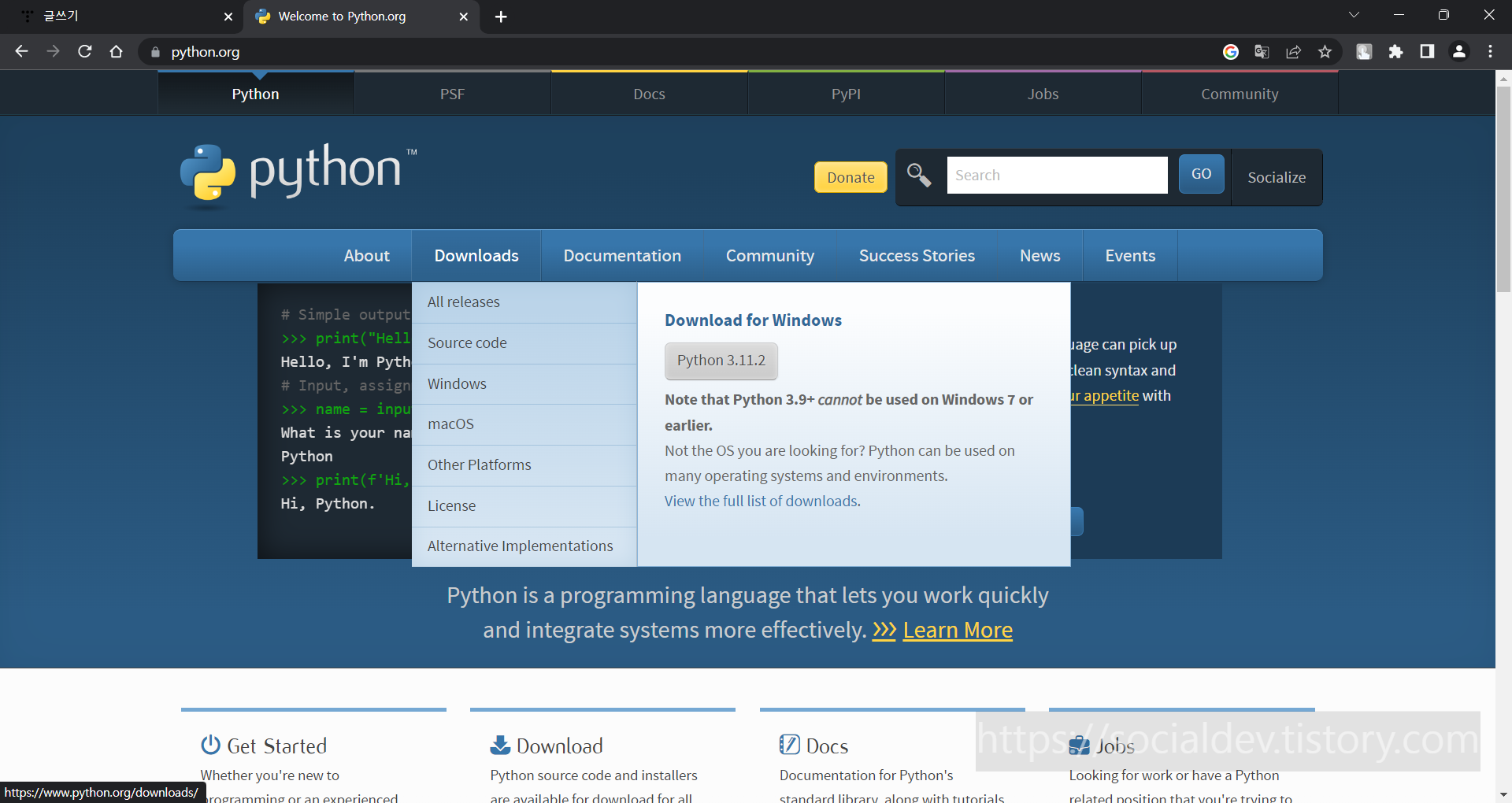 구글에 파이썬을 검색하면 홈페이지를 통해 설치가 가능하다.