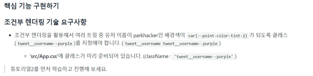 - 삼항연산자를 이용하여 유저 이름이 parhacker이면, tweet__username tweet__username--puple css가 적용될 수 있도록 코드를 작성한다.