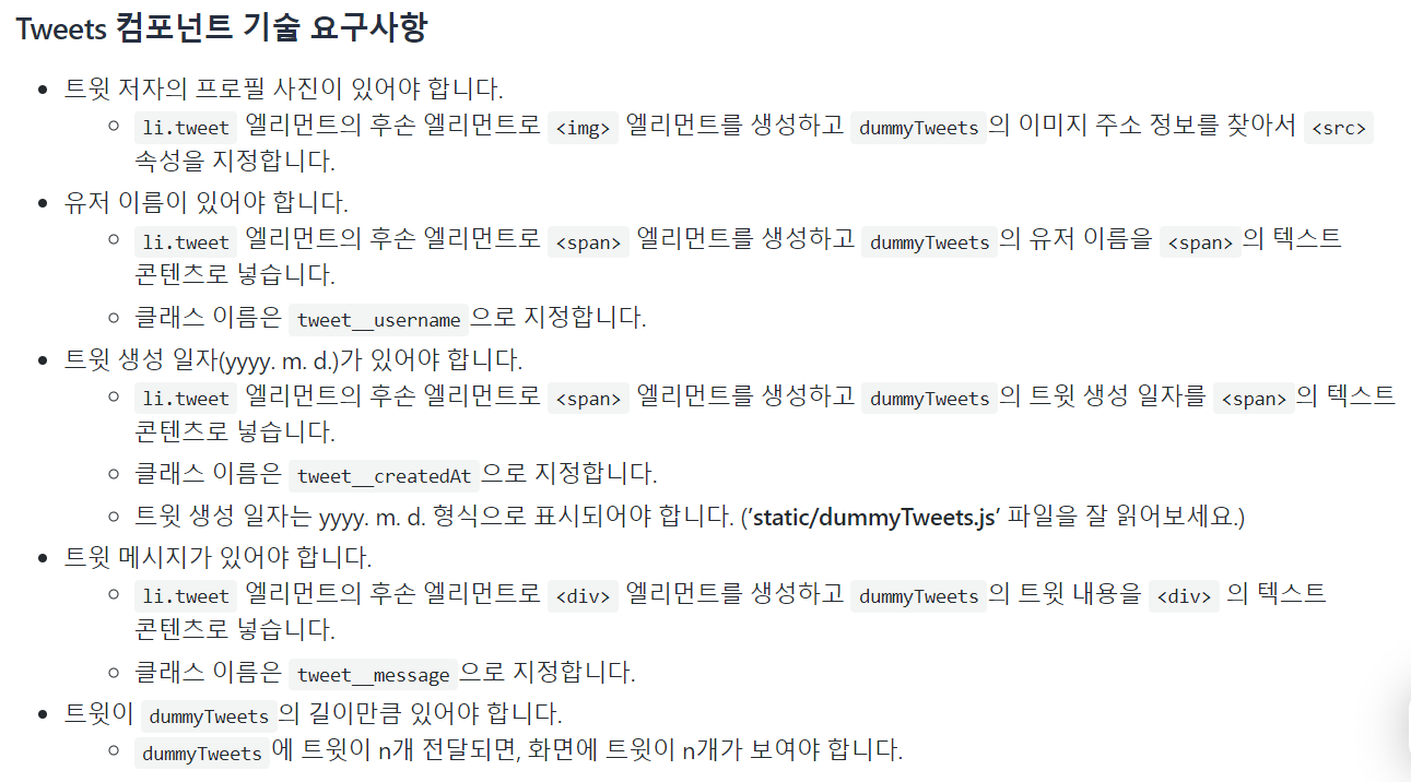 - 배열( [ ] )로 저장되어있는 더미데이터의 개수는 더미데이터의 길이와 같기 때문에 {'total: ' + dummyTweets.length}를 작성한다(내가 작성한 코드는 total:{dummyTweets[dummyTweets.length-1].id}라고 풀었다.}