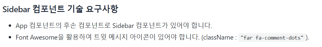 - public 디렉토리에 index.html 파일을 열어보면, Font Awesome 링크가 연동되어 있음을 확인할 수 있다. 이에 Sidebar 컴포넌트 <section> 태그 하위에 아이콘을 의미하는 <i>태그를 입력하고, <i>의 css 클래스네임으로 className = "far fa-comment-dots"를 작성한다.