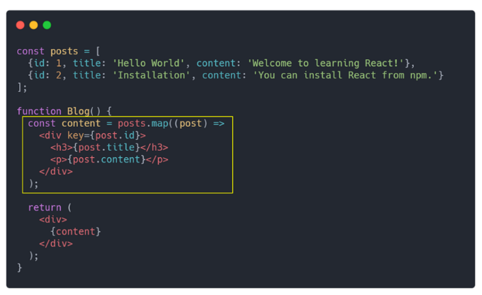 - 여러 개의 HTML 엘리먼트를 표시할 때, map() 함수 이용. map 함수 사용 시 반드시 "key" JSX 속성을 넣어야 함.