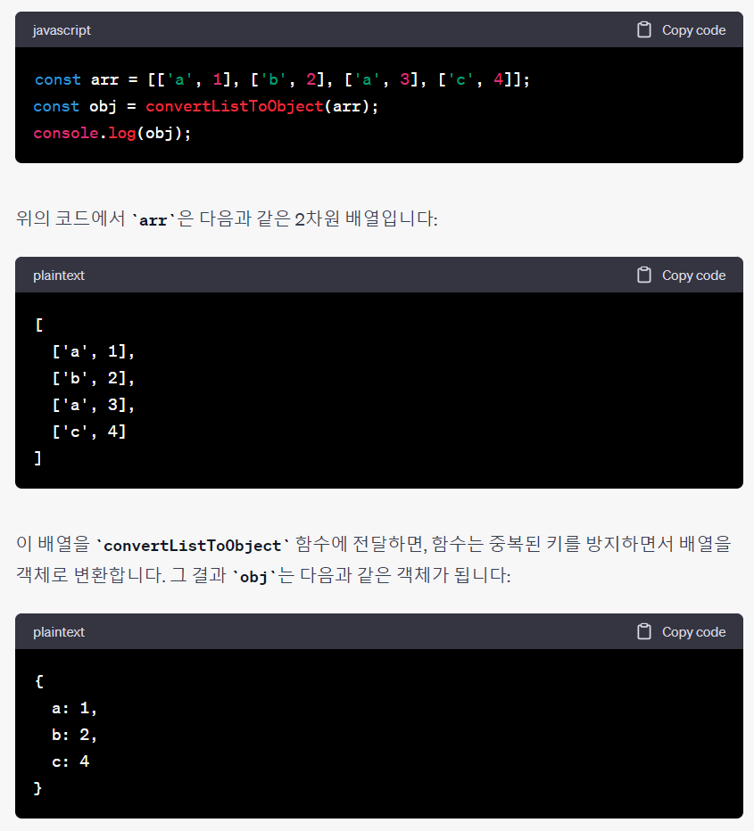 문제를 풀면서 (obj[arr[i][0]] === undefined) 조건이 왜 들어가야 하는지 이해가 되지 않았다. 이에 챗 GPT에게 물어보았다.