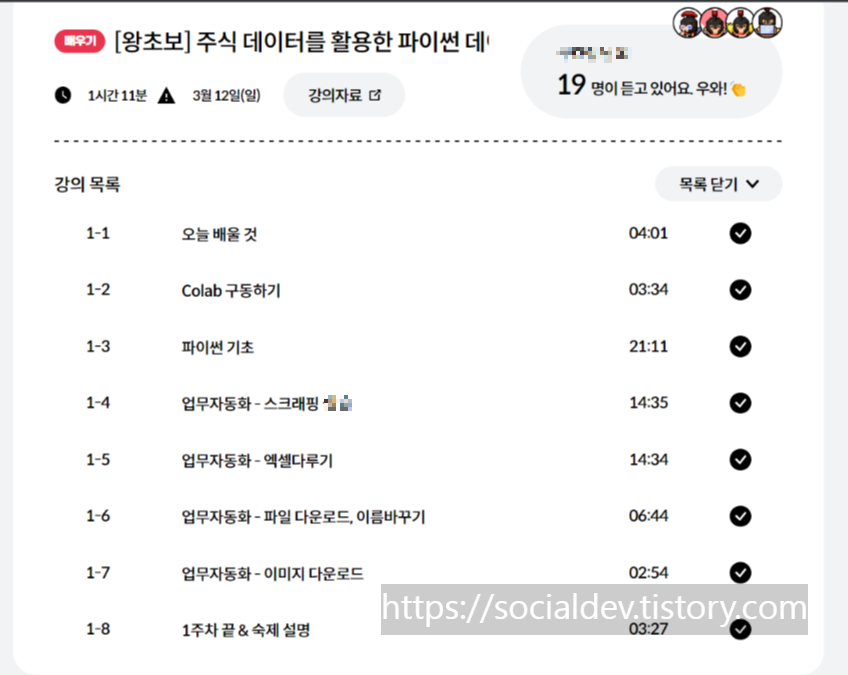 게으름을 이겨내고 5주차까지 여유있게 들을 수 있을거란 생각은 역시나.. 오산이었다.. 그래도 4주차까지 진행한나 대견해.. 내일 파이썬 강의 완주해보자! 4주차에서는 시가, 종가 등의 가격 데이터를 가지고, 그래프를 그려보았다. 이 외에도 이동평균선을 구하는 방법과 이를 이용하여 최적의 수익률을 찾는 방법을 알아보았다. 우선 그래프를 그리기 위해 사용한 명령어 .plot 이를 이용해 종가 그래프를 비롯하여 두개 종목의 종가 그래프도 그려볼 수 있었다. 이동평균선을 만들기 위해서는 .rolling() 이라는 명령어를 사용하였다. .rolling은 누적 곱하기를 하라는 명령어로, .rolling(3)을 할 경우, (1, 2, 3), (2, 3, 4), (3, 4, 5) ... 와 같이 곱셈을 진행하여 표현..