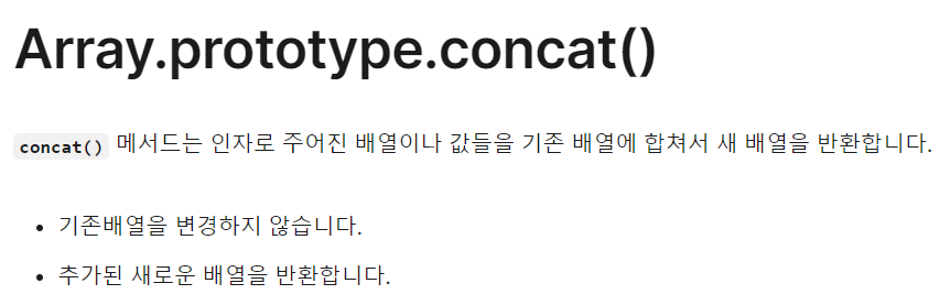 문제 출처 : 코드스테이츠 URCLASS 코플릿 풀이 코드 function joinArrayOfArrays(arr) { return arr.reduce((acc, cur) => acc.concat(cur)) } 배열끼리만 합쳐지는 것이라고 생각했었는데, 값도 기존 배열에 합쳐진다. https://developer.mozilla.org/ko/docs/Web/JavaScript/Reference/Global_Objects/Array/concat Array.prototype.concat() - JavaScript | MDN concat() 메서드는 인자로 주어진 배열이나 값들을 기존 배열에 합쳐서 새 배열을 반환합니다. developer.mozilla.org